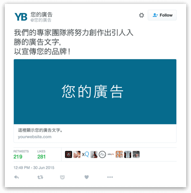 47%在Twitter 上关注特定品牌的用户大多都会浏览该公司的网站,在Twitter上与你的目标客户进行互动能为品牌增添一些最忠实、最活跃的客户。让我们来助你扩大品牌的影响力,作好准备迎接潜在商机。